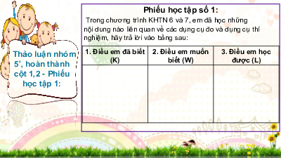 Thảo luận nhóm 1. Điều em đã biết 2. Điều em muốn 3. Điều em học 5’, hoàn thành (K) biết (W) được (L) cột 1,2 - Phiếu học tập 1: HOẠT ĐỘNG 2: HÌNH THÀNH KIẾN THỨC