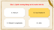 Câu 1. Quốc vương đang cai trị nước Anh là: A. Henry II B. Vua C V harles III C. Edward I Longshanks D. John