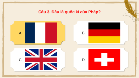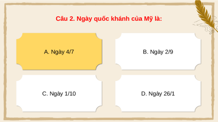 Câu 2. Ngày quốc khánh của Mỹ là: A. Ngày 4/7 B. Ngày 2/9 C. Ngày 1/10 D. Ngày 26/1