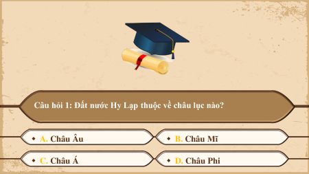 Câu hỏi 1: Đất nước Hy Lạp thuộc về châu lục nào? A. Châu Âu B. Châu Mĩ C. Châu Á D. Châu Phi