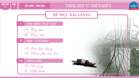 ĐỀ MỤC BÀI GIẢNG I TRI THỨC NGỮ VĂN A. Tùy bút B. Tản văn II ĐỌC VĂN BẢN A. Tìm hiểu chung B. Khám phá văn bản III TỔNG KẾT A. Nội dung B. Nghệ thuật NGỮ VĂN BÀI 11