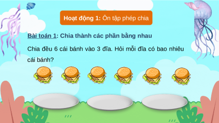 Chia đều 6 cái bánh vào 3 đĩa. Hỏi mỗi đĩa có bao nhiêu cái bánh?