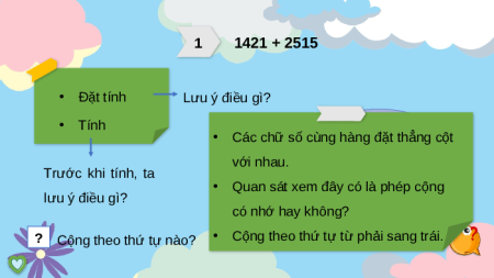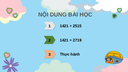 tạo không khí lớp học vui tươi. PHÉP CỘNG CÁC SỐ TRONG PHẠM VI 10 000 (2 tiết) NỘI DUNG BÀI HỌC 1 1421 + 2515 2 1421 + 2719 3 Thực hành