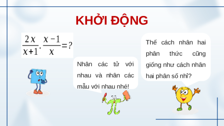 ệ chào đón các em đ n ế với ti t h ế c ọ ngày hôm nay KHỞI ĐỘNG 2 𝑥 𝑥 −1 . =? Thế cách nhân hai 𝑥+1 𝑥 phân thức cũng Nhân các tử với giống như cách nhân nhau và nhân các hai phân số nhỉ? mẫu với nhau nhé! CHƯƠNG VI.