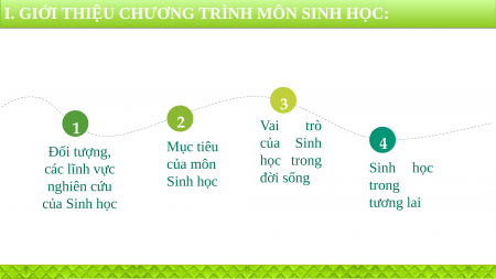 SỰ PHÁT TRIỂN BỀN VỮNG I. GIỚI TH IỆU CHƯƠNG T RÌN Ì H MÔN SIN SI H HỌC: 3 Vai trò 1 2 của Sinh Mục tiêu Đối tượng, 4 học trong của môn các lĩnh vực Sinh học đời sống Sinh học nghiên cứu trong của Sinh học tương lai