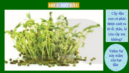 thực vật, động vật? Lấy VD minh họa. HĐ 1: MỞ ĐẦU Cây đậu con có phải được sinh ra từ rễ, thân, lá của cây mẹ không? Video Sự nảy mầm của hạt đậu HĐ 1: MỞ ĐẦU