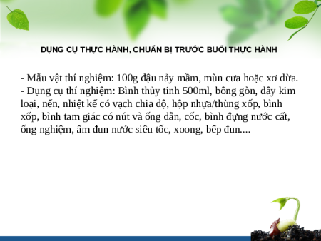 - Mẫu vật thí nghiệm: 100g đậu nảy mầm, mùn cưa hoặc xơ dừa.
