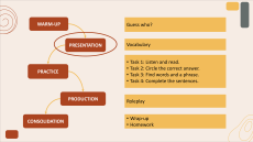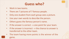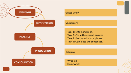 • Task 4: Complete the sentences. PRODUCTION Roleplay • Wrap-up CONSOLIDATION • Homework WARM-UP Guess who? • Work in two teams.