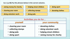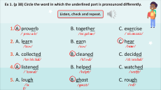 the language they have learnt in Units 1 – 2 – 3. Pronunciation /ə/ and /ɜː/ /f/ and /v/ /t/, /d/, and /ɪd/. 1. A. proverb B. together C. exercise /ˈprɒv.ɜːb/ /təˈɡeð.ər/ /ˈek.sə.saɪz/ 2. A. learn B. earn C. hear /lɜːn/ /ɜːn/ /hɪər/ 3. A. col ected B. cleaned C. decided /kəˈlek.tɪd/ /kliːnd/ /dɪˈsaɪdɪd/ 4. A. listened B. helped C. watched /ˈlɪsənd/ /helpt/ /wɒtʃt/ 5. A. laugh B. ghost C. rough /lɑː /ɡəʊst/ /rʌf/ f/