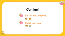 1 In the playground Warm-up Let’s sing. Content Listen and repeat. Point and say.