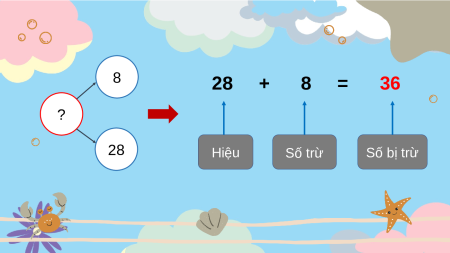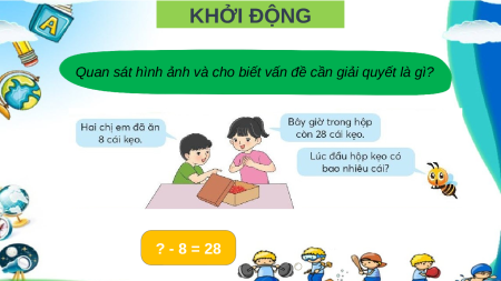 Quan sát hình ảnh và cho biết vấn đề cần giải quyết là gì? ? - 8 = 28 TÌM SỐ BỊ TRỪ, SỐ TRỪ Tìm số bị trừ .?. - 8 = 28 Số bị trừ Số trừ Hiệu