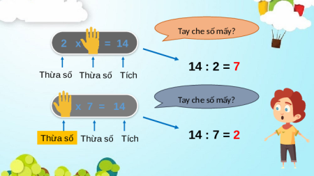 Hoạt động 1: Giới thiệu cách tìm thừa số chưa biết 2 x 7 = 14 Thừa số Thừa số Tích