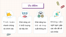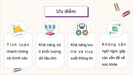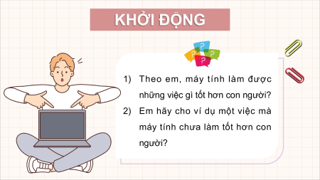 máy tính chưa làm tốt hơn con người? Ưu điểm T í n h t o á n Khả năng xử Khả năng lưu K h ô n g c ầ n nhanh chóng lí khối lượng t r ữ v à t r u y nghỉ ngơi, gặp và chính xác dữ liệu lớn xuất thông tin các vấn đề về sức khỏe