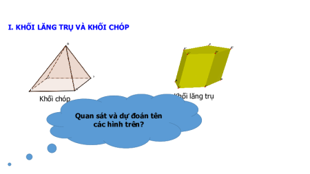 I. KHỐI LĂNG TRỤ VÀ KHỐI CHÓP Hình chóp Hình lăng trụ Hãy nêu tên các hình trên