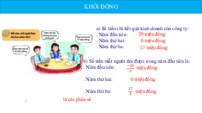 b) Số tiền mỗi người thu được trong năm đầu tiên là: . Năm đầu tiên: −20 triệu đồng 3 . Năm thứ hai: 0 triệu đồng 17 . Năm thứ ba: triệu đồng 3 ; là các phân số