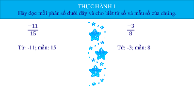 Hãy đọc mỗi phân số dưới đây và cho biết tử số và mẫu số của chúng. −11 −3 15 8 Tử: -11; mẫu: 15 Tử: -3; mẫu: 8
