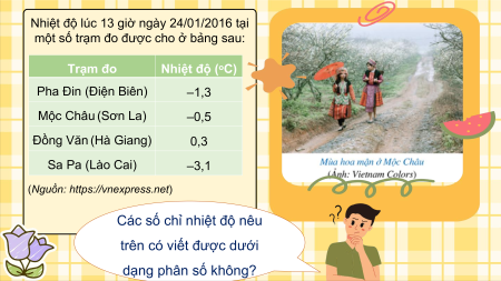 một số trạm đo được cho ở bảng sau: Trạm đo Nhiệt độ (oC) Pha Đin (Điện Biên) –1,3 Mộc Châu (Sơn La) –0,5 Đồng Văn (Hà Giang) 0,3 Sa Pa (Lào Cai) –3,1