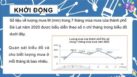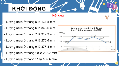 Đà Lạt năm 2020 được biểu diễn theo số n chỉ tháng trong biểu đồ dưới đây. Quan sát biểu đồ và cho biết lượng mưa ở mỗi tháng là bao nhiêu. KHỞI ĐỘNG Kết quả