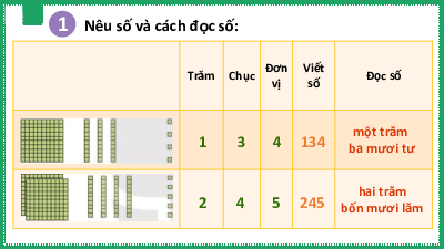 1 Nêu số và cách đọc số: Đơn Viết Trăm Chục Đọc số vị số một trăm 1 3 4 134 ba mươi tư hai trăm 2 4 5 245 bốn mươi lăm