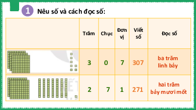 1 Nêu số và cách đọc số: Đơn Viết Trăm Chục Đọc số vị số ba trăm 3 0 7 307 linh bảy hai trăm 2 7 1 271 bảy mươi mốt