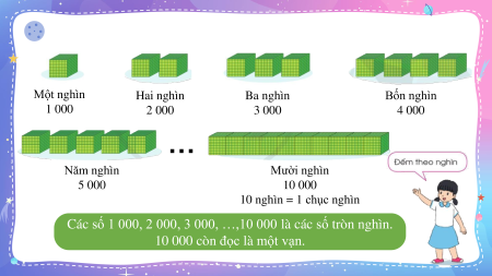 Toán Toán 3 Các số trong phạm vi 10 000 01 01 KHỞI ĐỘNG 02 02 KHÁM PHÁ 1 đơn vị Viết số: 1 10 đơn vị = 1 chục Viết số: 10 10 chục = 1 trăm 100 trăm = 1 nghìn Viết số: 100 Viết số: 1000