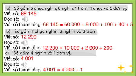 Viết số thành tổng: 68 145 = 60 000 + 8 000 + 100 + 40 + 5 Viết số: 12 200 Đọc số: