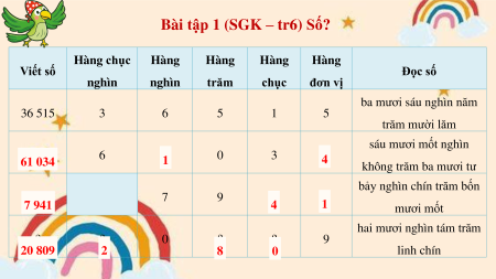 Bài tập 1 (SGK – tr6) Số? Hàng chục Hàng Hàng Hàng Hàng Viết số Đọc số nghìn nghìn trăm chục đơn vị ba mươi sáu nghìn năm 36 515 3 6 5 1 5 trăm mười lăm sáu mươi mốt nghìn ? 6 ? 0 3 ? 61 034 1 4 không trăm ba mươi tư bảy nghìn chín trăm bốn ? 7 9 ? ? 7 941 4 1 mươi mốt hai mươi nghìn tám trăm ? ? 0 ? ? 9 20 809 2 8 0 linh chín