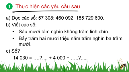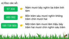 a) Đọc các số: 57 308; 460 092; 185 729 600. b) Viết các số: