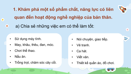 a) Chia sẻ những việc em có thể làm tốt: • Sử dụng máy tính. • Nói chuyện, giao tiếp. •