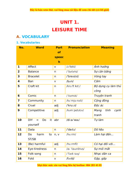 UNIT 1. LEISURE TIME A. VOCABULARY 1. Vocabularies No. Word Part Pronunciation Meaning of speec h 1 Affect v /əˈfekt/ Ảnh hưởng 2 Balance n /ˈbæləns/ Sự cân bằng 3 Bracelet n /'breɪslət/ Vòng tay 4 Ban v /bæn/ Cấm 5 Craft kit n /krɑːft kɪt /
