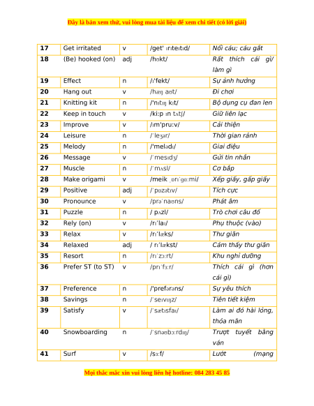 17 Get irritated v /get' ɪrɪteɪtɪd/ Nổi cáu; cáu gắt 18 (Be) hooked (on) adj /hʊkt/ Rất thích cái gì/ làm gì 19 Effect n /ɪ'fekt/ Sự ảnh hưởng 20 Hang out v /hæŋ aʊt/ Đi chơi 21 Knitting kit n /'nɪtɪŋ kɪt/