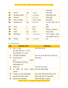 Lạ lẫm (đối với ai đó) 47 Trick n /trɪk/ Mẹo 48 Tool n /tu:l/ Công cụ; dụng cụ 49 Total adj /ˈtəʊtl/ Tông cộng 50 Volunteer n, v /ˌvɒlənˈtɪər/ Tình nguyên viên, tình nguyên làm gì 51 Virtual adj /ˈvɜːrtʃuəl/ Ảo 2. Collocations No. Phrasal verb Meaning 1 like + V-ing thích làm gì đó be quite keen on + V-ing be a big fan of + Ving 2 intrigue somebody