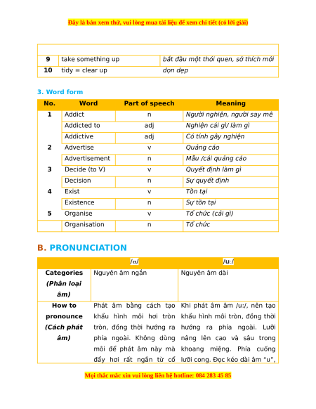Quyết định làm gì Decision n Sự quyết định 4 Exist v Tồn tại Existence n Sự tồn tại 5 Organise v Tổ chức (cải gì) Organisation n Tổ chức B. PRONUNCIATION /ʊ/ /uː/ Categories Nguyên âm ngắn Nguyên âm dài (Phân loại âm) How to
