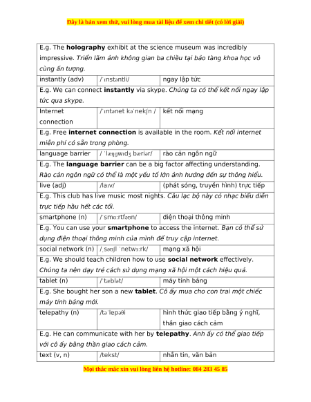 communicative /kəˈmjuːnɪkətɪv/ (adj) có tính chất giao tiếp interact (v) /ˌɪntərˈækt/ tương tác interaction (n) /ˌɪntərˈækʃn sự tương tác interactive (adj) /ˌɪntərˈæktɪv/ có tính tương tác instantly (adv) /ˈɪnstəntli/ ngay lập tức instant (adj) /ˈɪnstənt/ liền, ngay telepathy (n) /təˈlepəθi/ thần giao cách cảm telepathic (adj) /ˌtelɪˈpæθɪk/ thuộc về ngoại cảm telepathically
