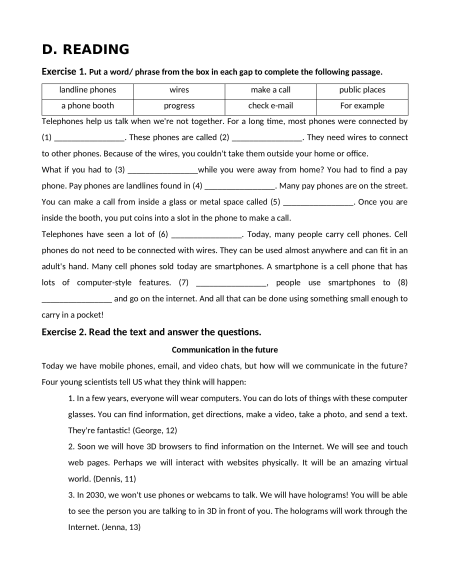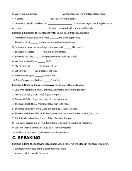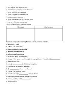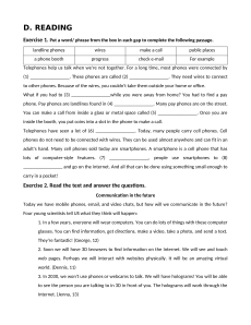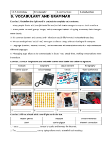 Exercise 2. Choose the word which is stressed differently from the others. 1. A. tablet B. webcam C. pigeon D. agree 2. A. mobile B. social C. message D. trainee 3. A. smartphone B. network C. language D. Chinese 4. A. meaning B. easy C. instant D. machine 5. A. private B. become C. reply D. repeat 6. A. Internet B. conference C. telephone D. guarantee 7. A. Japanese B. popular C. overcome D. Vietnamese 8. A. teenager B. company C. battery D. awardee 9. A. translation B. interrupt C. Portuguese D. disappear 10. A. technology B. holography C. communicate D. disadvantage B. VOCABULARY AND GRAMMAR