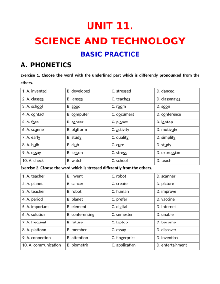 Exercise 2. Choose the word which is stressed differently from the others. 1. A. teacher B. invent C. robot D. scanner 2. A. planet B. cancer C. create D. picture 3. A. teacher B. robot C. human D. improve 4. A. period B. planet C. prefer D. vaccine 5. A. important B. element C. digital D. Internet 6. A. solution B. conferencing C. semester D. unable 7. A. frequent B. future C. laptop D. become 8. A. platform B. member C. essay D. discover 9. A. connection B. attention C. fingerprint D. invention 10. A. communication B. biometric C. application D. entertainment B. VOCABULARY AND GRAMMAR