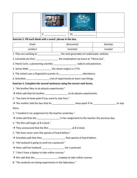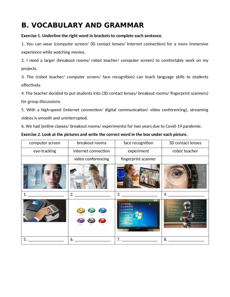 Exercise 2. Look at the pictures and write the correct word in the box under each picture. computer screen breakout rooms face recognition 3D contact lenses eye-tracking Internet connection experiment robot teacher video conferencing fingerprint scanner 1. ________________ 2. ________________ 3. ________________ 4. ________________ 5. ________________ 6. ________________ 7. ________________ 8. ________________ 9. ________________ 10. ________________