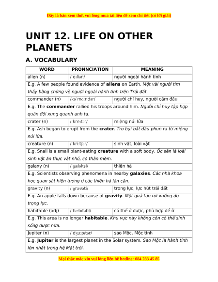 UNIT 12. LIFE ON OTHER PLANETS A. VOCABULARY WORD PRONNCIATION MEANING alien (n) /ˈeɪliən/ người ngoài hành tinh