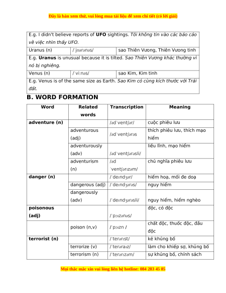 E.g. Venus is of the same size as Earth. Sao Kim có cùng kích thước với Trái đất. B. WORD FORMATION Word Related Transcription Meaning words adventure (n) /ədˈventʃər/ cuộc phiêu lưu adventurous