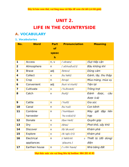 UNIT 2. LIFE IN THE COUNTRYSIDE A. VOCABULARY 1. Vocabularies No. Word Part Pronunciation Meaning of speec h 1 Access n, v /ˈækses/ (Sự) tiếp cận 2 Atmosphere n /ˈætməsfɪə(r)/ Bầu không khí 3 Brave adj /breɪv/ Dũng cảm 4 Collect v /kəˈlekt/