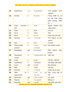 Người (thành thị/ folk nông thôn) 21 Feed v /fi:d/ Cho án 22 Ferry n /'ferɪ/ Phà 23 Herd v /hɜːrd/ Chăn giữ vật nuôi 24 Harvest v, n /ˈhɑːrvɪst/ Thu hoạch, vụ thu hoợch 25 Hay n /heɪ/ Cỏ khô 26 Home-made n /ˌhəʊm