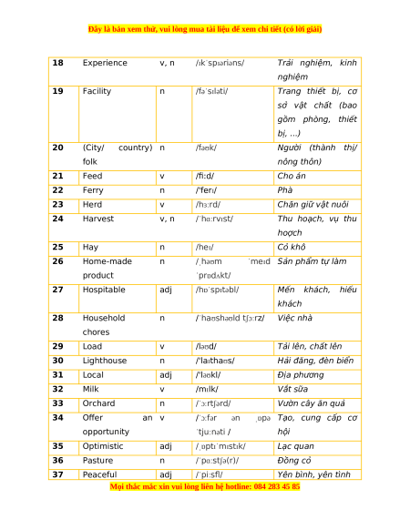 18 Experience v, n /ɪkˈspɪəriəns/ Trải nghiệm, kinh nghiệm 19 Facility n /fəˈsɪləti/