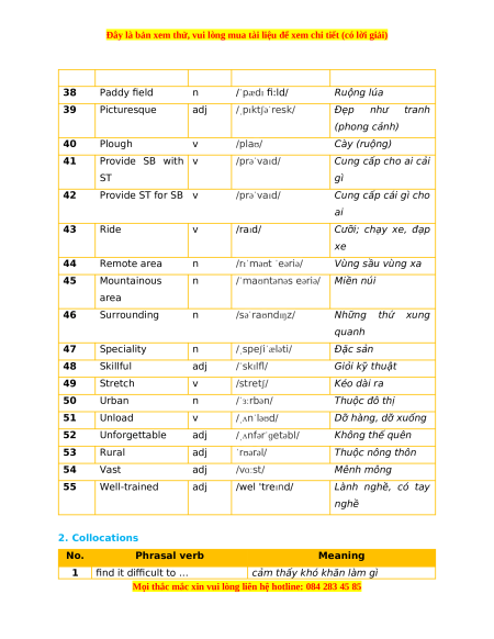 Dỡ hàng, dỡ xuống 52 Unforgettable adj /ˌʌnfərˈɡetəbl/ Không thế quên 53 Rural adj ˈrʊərəl/ Thuộc nông thôn 54 Vast adj /vɑːst/ Mênh mông 55 Well-trained adj /wel 'treɪnd/ Lành nghề, có tay nghề 2. Collocations No. Phrasal verb Meaning 1 find it difficult to ...