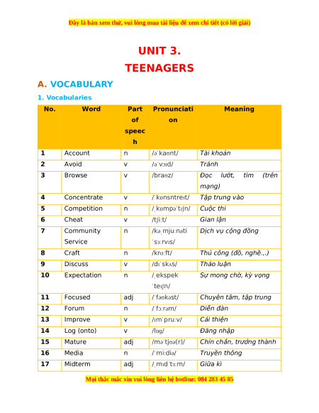 UNIT 3. TEENAGERS A. VOCABULARY 1. Vocabularies No. Word Part Pronunciati Meaning of on speec h 1 Account n /əˈkaʊnt/ Tài khoản 2 Avoid v /əˈvɔɪd/ Tránh 3 Browse v /braʊz/