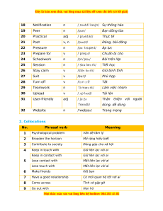 Thân thiện với người ˈfrendli/ dùng, dễ dùng 32 Website n /'websaɪ/ Trang mạng 2. Collocations No. Phrasal verb Meaning 1 Psychological problem Vấn đề tâm lý 2 Broaden the horizon