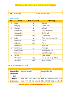 Không còn thân thiết 3. Word form No. Word Part of speech Meaning 1 Bully v Bắt nạt Bullying n Sự bắt nạt 2 Connect v Kết nối Connective adj Dùng để liên lạc Connection n Sự liên kết Connected adj Có quan hệ 3 Enjoy v