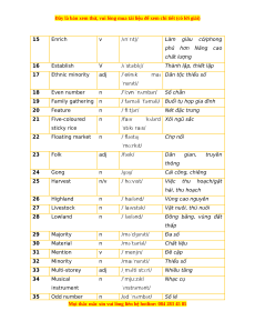 ˈkʌlərd Xôi ngũ sắc sticky rice ˈstɪkɪ raɪs/ 22 Floating market n /ˈfləʊtɪŋ Chợ nổi ˈmɑːrkɪt/ 23 Folk adj /fəʊk/ Dân gian, truyền thông 24 Gong n /ɡɒŋ/ Cải cồng, chiêng 25 Harvest n/v /ˈhɑːvɪst/