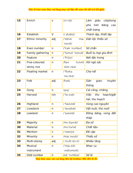 Vụ mùa, vụ trồng trọt 12 Custom n /ˈkʌstəm/ Phong tục tập quán 13 Documentary n /ˌdɒkjuˈmentri/ Phim tài liêu 14 Elaborate adj /ɪˈlæbərət/