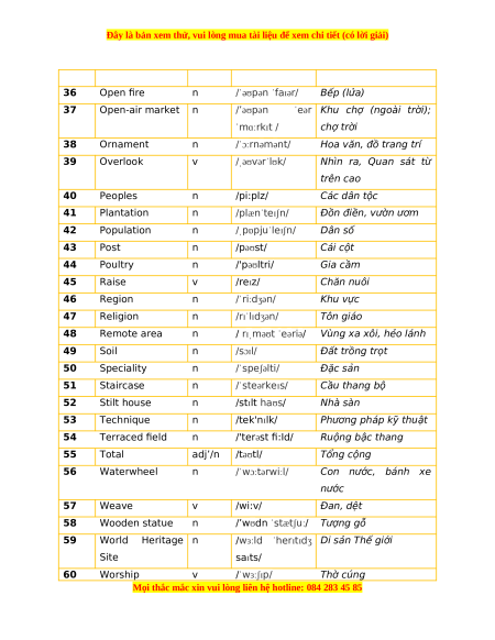 Phương pháp kỹ thuật 54 Terraced field n /'terəst fi:Id/ Ruộng bậc thang 55 Total adj’/n /təʊtl/ Tổng cộng 56 Waterwheel n /ˈwɔːtərwiːl/ Con nước, bánh xe nước 57 Weave v /wi:v/ Đan, dệt 58 Wooden statue n /’wʊdn ˈstætʃuː/ Tượng gỗ 59 World Heritage n