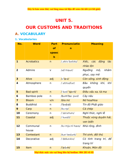 Bài tập bổ trợ nâng cao Unit 5: Our customs and traditions OUR Tiếng Anh lớp 8 Global success